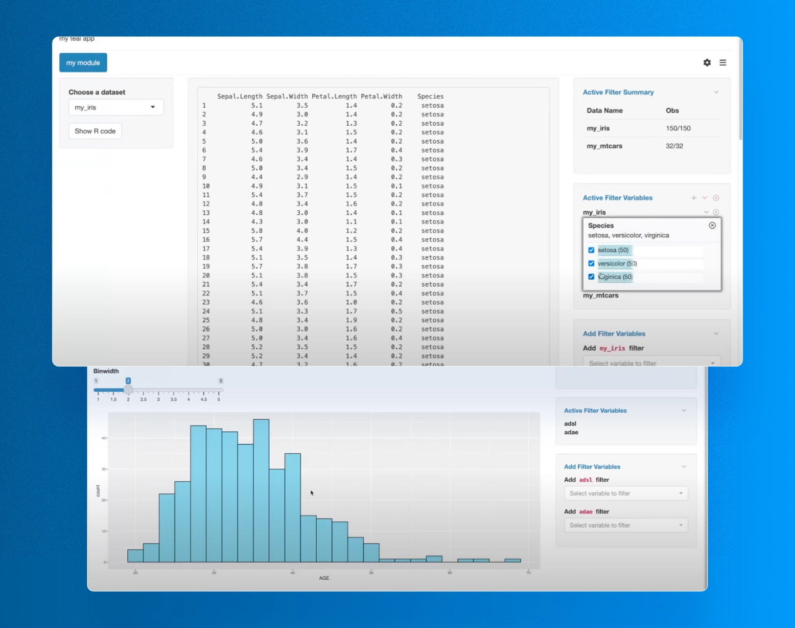 {teal} is an open-source Shiny framework for interactive clinical data exploration, designed to empower analysts working with CDISC datasets. As a community-driven initiative, {teal} is codeveloped by contributors across the pharmaceutical and tech industries, including Appsilon and leading global pharmaceutical companies.