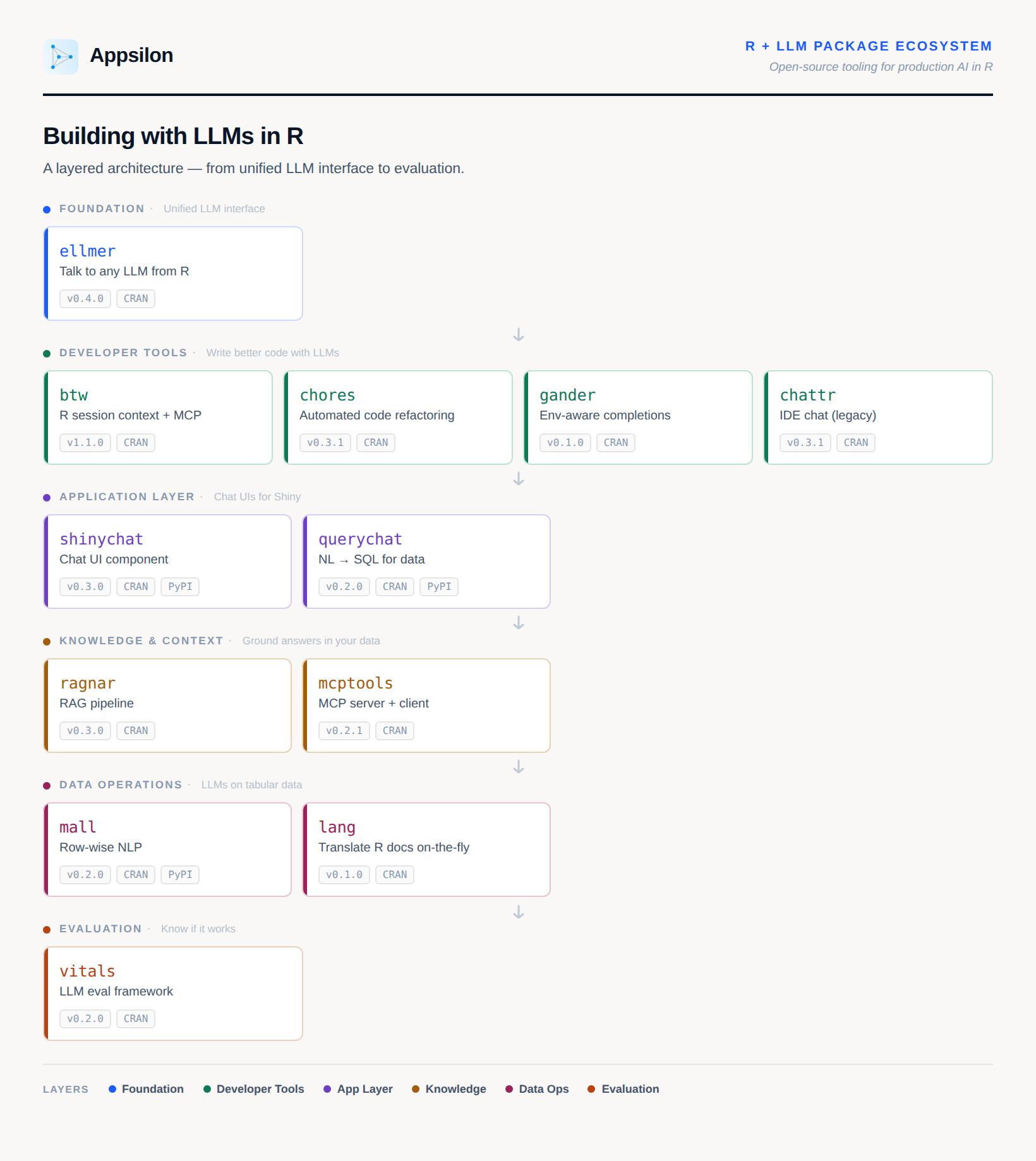 Packages like ellmer and chatlas are the foundation. shinychat, querychat, ragnar, mcptools, and vitals each solve one specific problem on top of that foundation. And the three start-here paths we discussed give you a clear entry point based on what you're actually building.